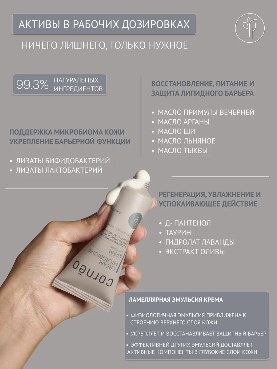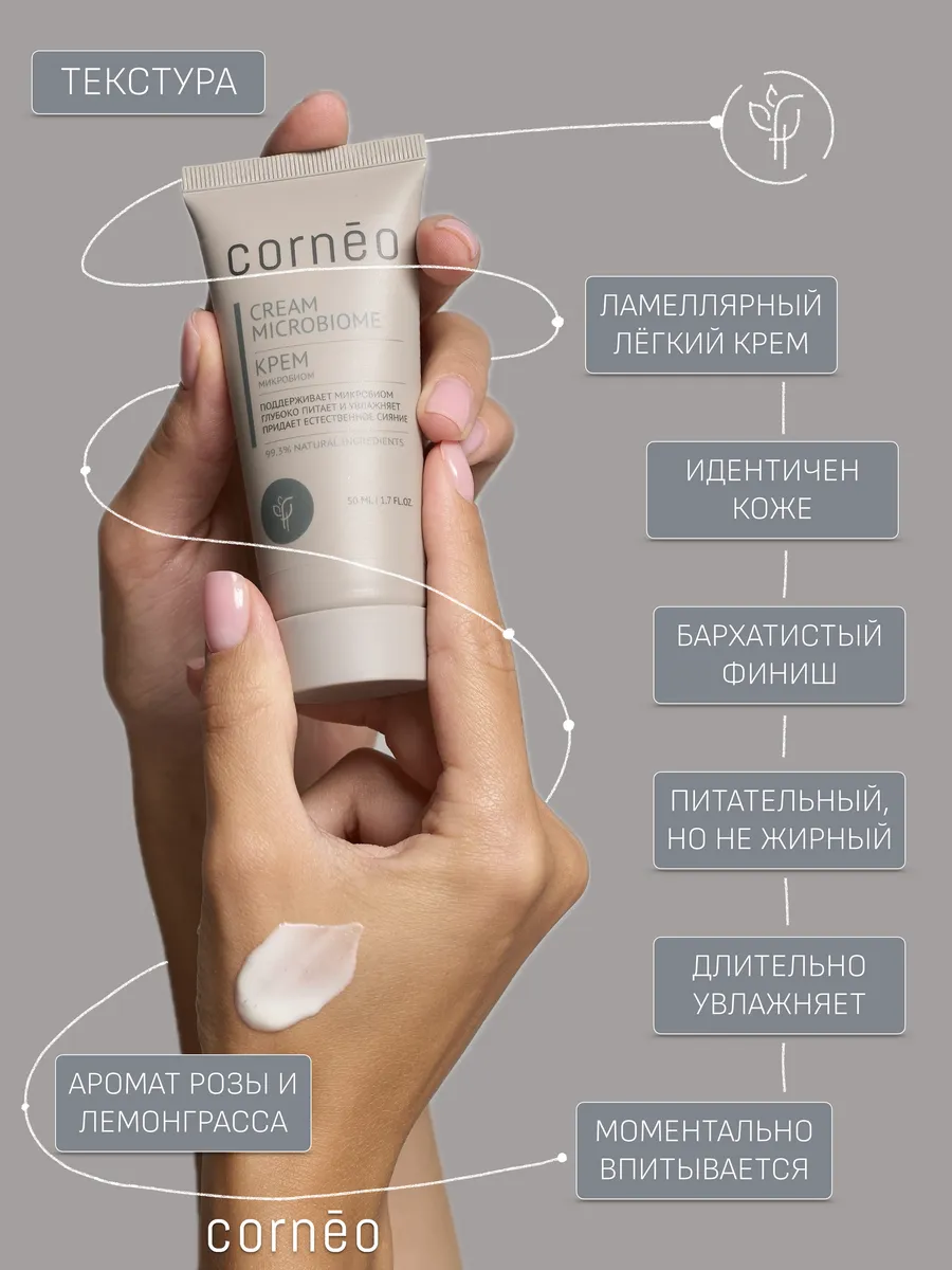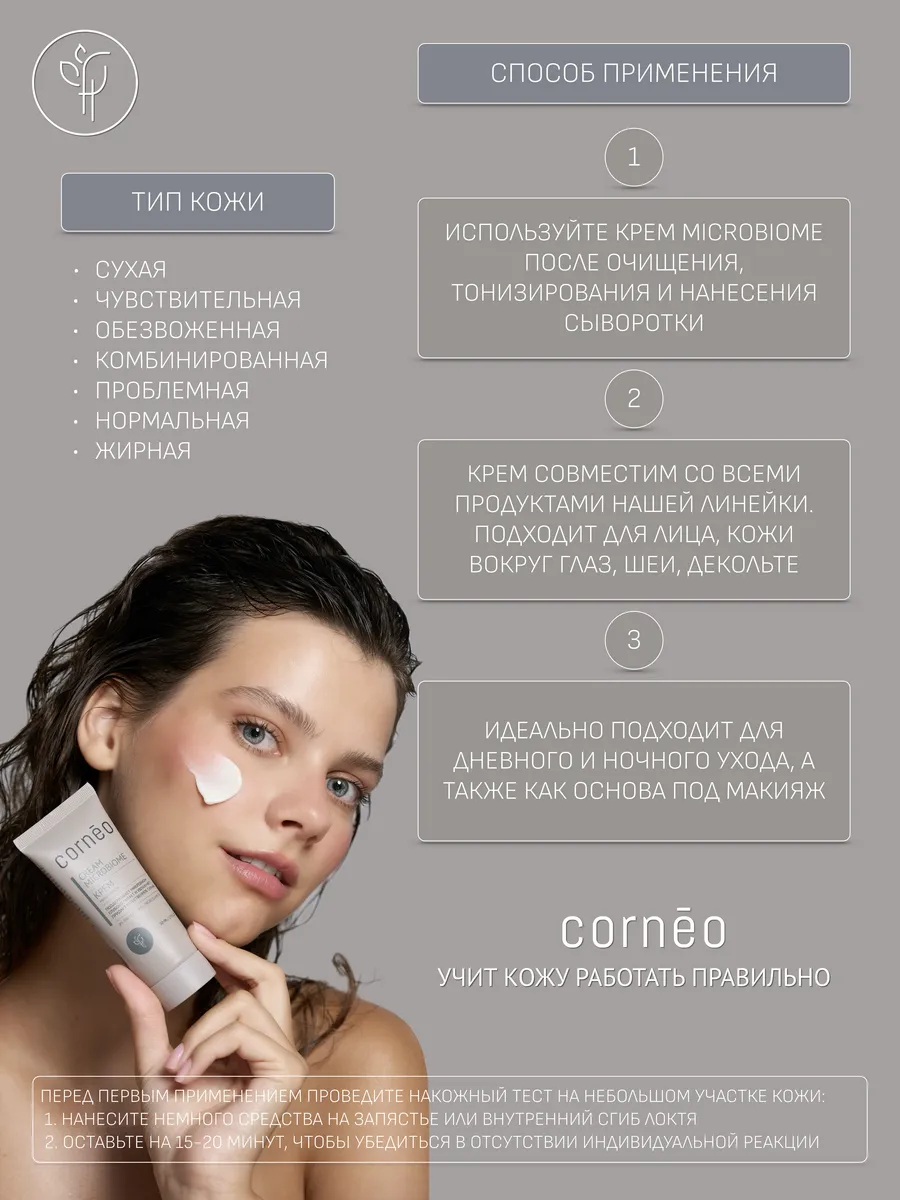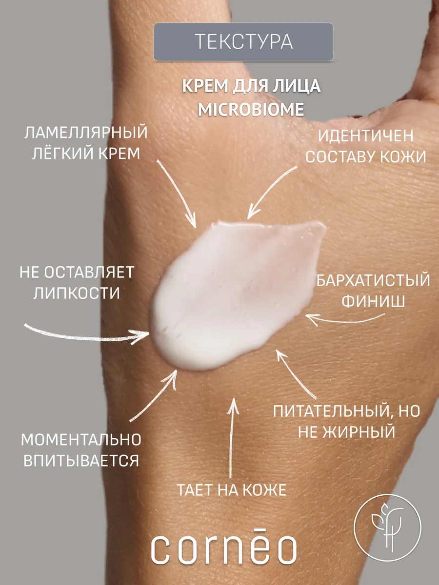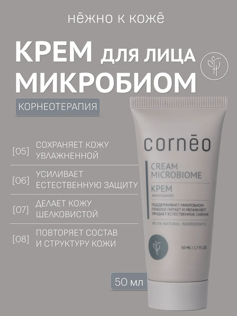 Крем для лица Microbiome для восстановления микробиома кожи, увлажняющий, с натуральным ингредиентами: лизаты бифидо- и лактобактерий, масла примулы вечерней, ши, арганы. Корнео