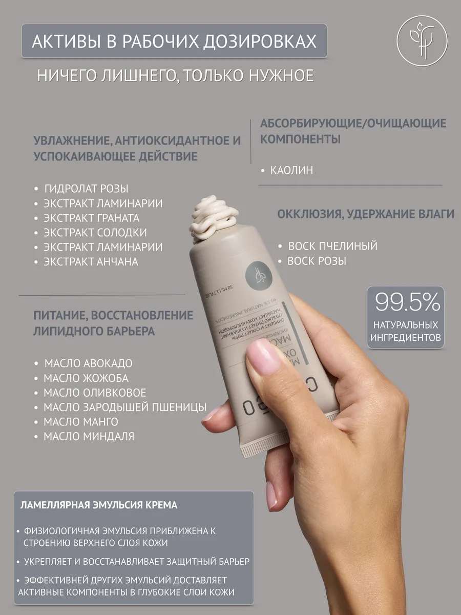 Маска представляет собой ламеллярную эмульсию, повторяет состав и структуру кожи. Учит кожу работать правильно. Восстанавливает липидный слой, усиливает барьерные функции, предотвращая испарение влаги. Способствует проникновению активных компонентов в глубокие слои кожи.