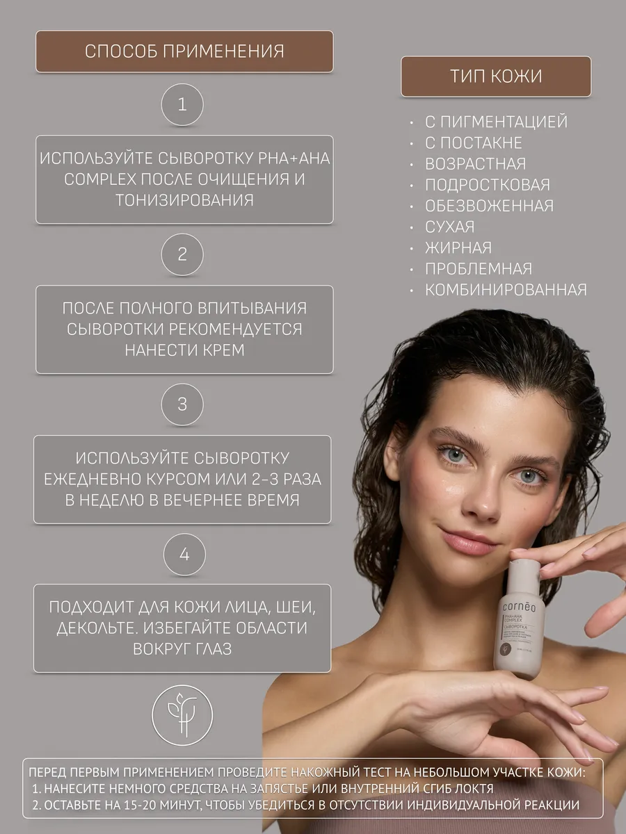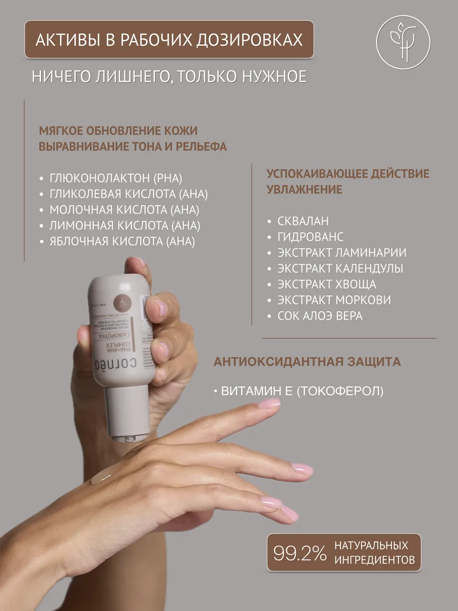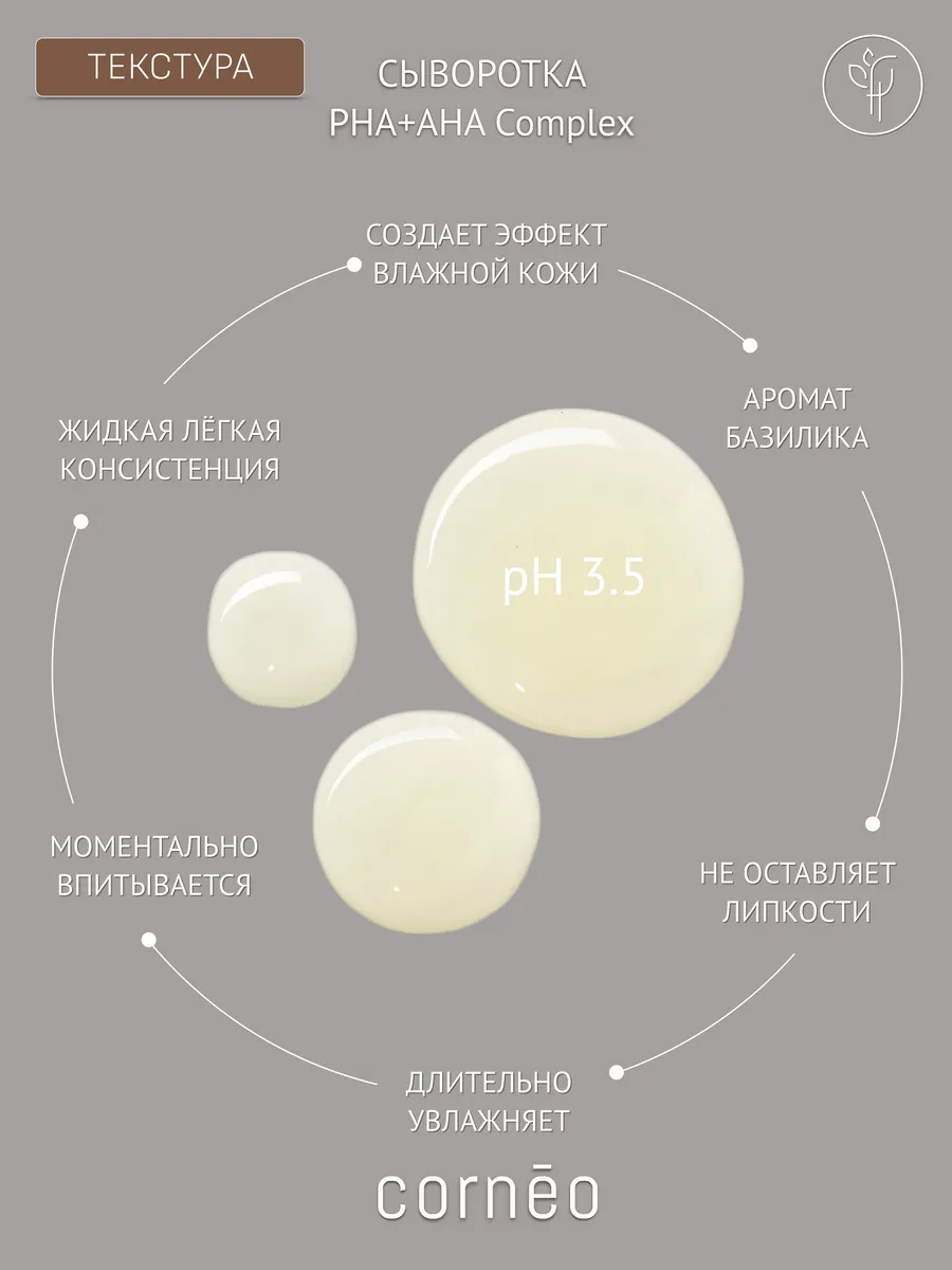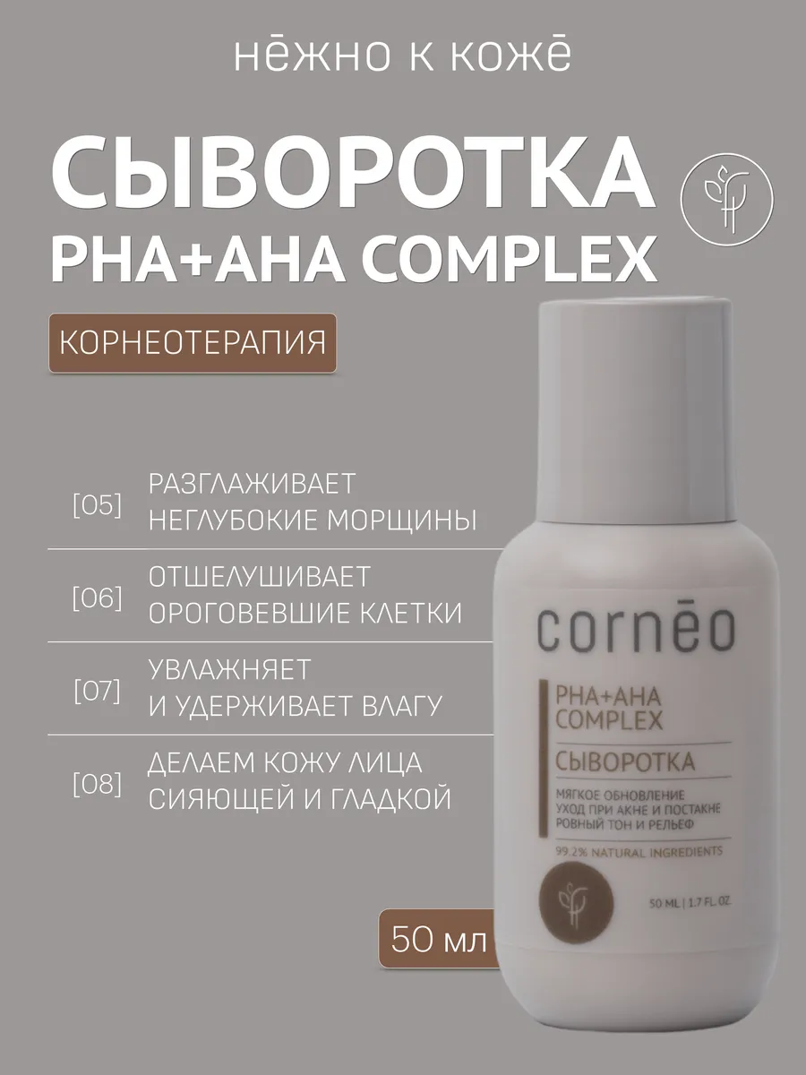 Сыворотка PHA+AHA Complex от Cornēo мягко обновляет клетки кожи и стимулирует выработку коллагена. Питает и восстанавливает липидный барьер. Увлажняет и уменьшает мимические морщины. Глубоко очищает и визуально сужает поры. Улучшает текстуру кожи, придавая ей здоровое сияние. Быстро впитывается, не оставляет липкости.