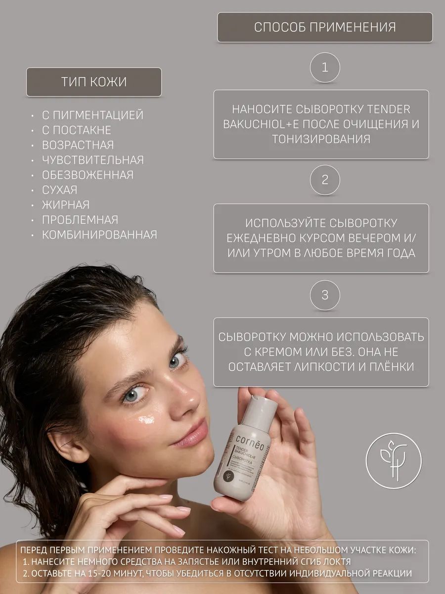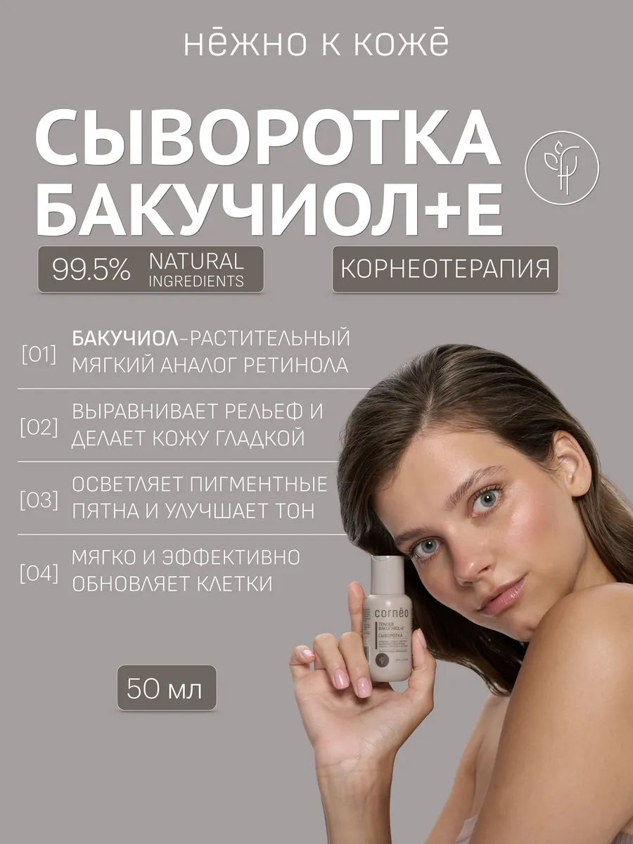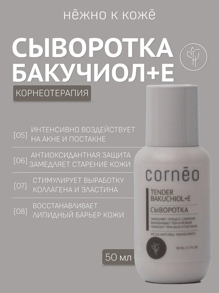 Сыворотка с Бакучиолом для лица для мягкого отшелушивания, обновления клеток кожи, для увлажнения с скваланом, соком алоэ вера, витамином Е, экстрактом оливы и шалфея. Корнео