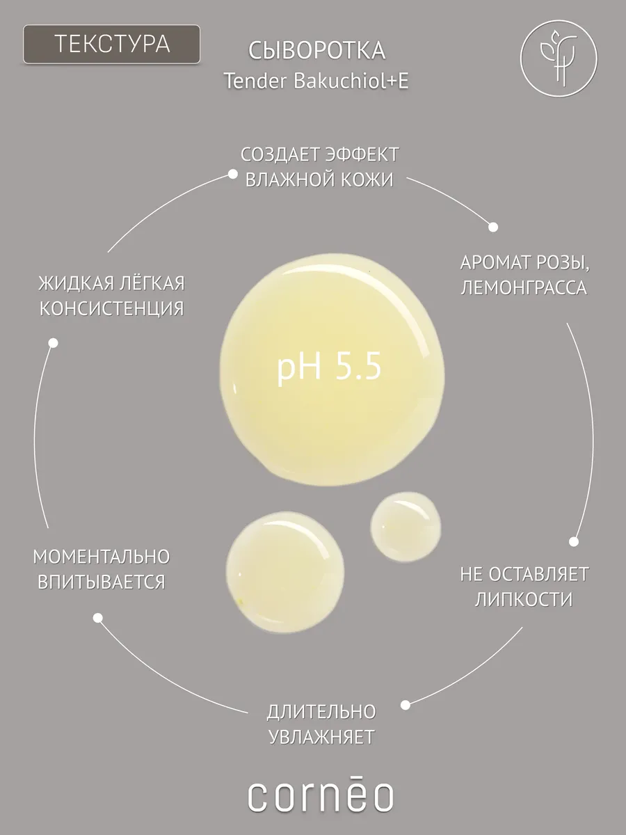Сыворотка Tender Bakuchiol+E [Нежный Бакучил+Е] для лица от Cornēo содержит Бакучиол - это мягкий растительный компонент, используемый как альтернатива ретинолу. Действует деликатно, но эффективно. Стимулирует обновление кожи и выработку коллагена. Нормализует деятельность сальных желез. Обеспечивает антиоксидантную защиту. Улучшает эластичность, тонус и текстуру кожи. Увлажняет и укрепляет липидный барьер. Быстро впитывается, не оставляет липкости.