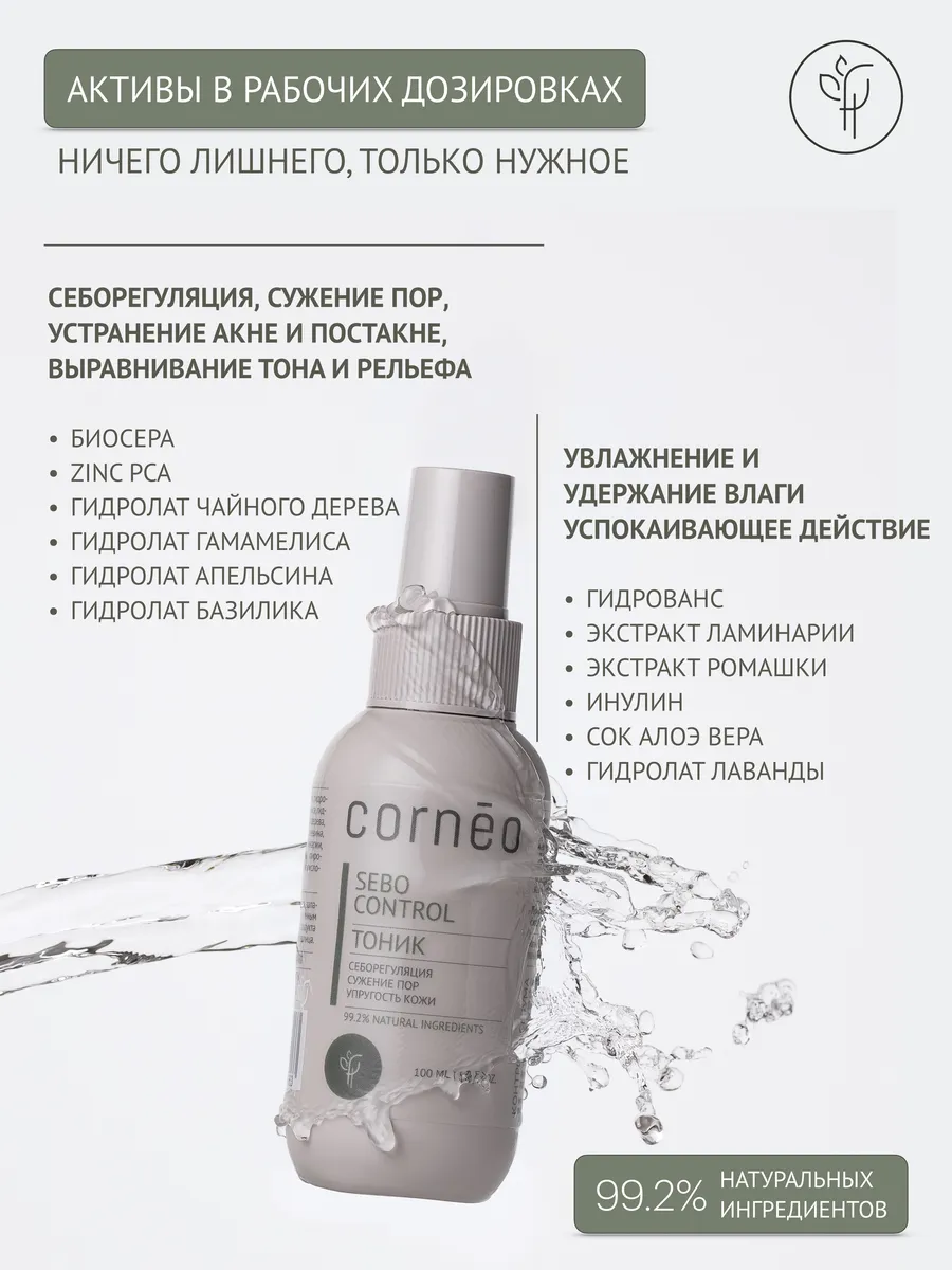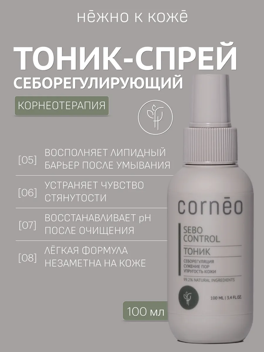 Тоник спрей Sebo control от Cornēo разработан для жирной и проблемной кожи. Регулирует деятельность сальных желез, уменьшает жирный блеск. Мягко отшелушивает и очищает поры. Препятствует закупорке пор. Увлажняет и тонизирует. Стимулирует выработку коллагена и эластина. Лёгкая формула тоника незаметна на коже.